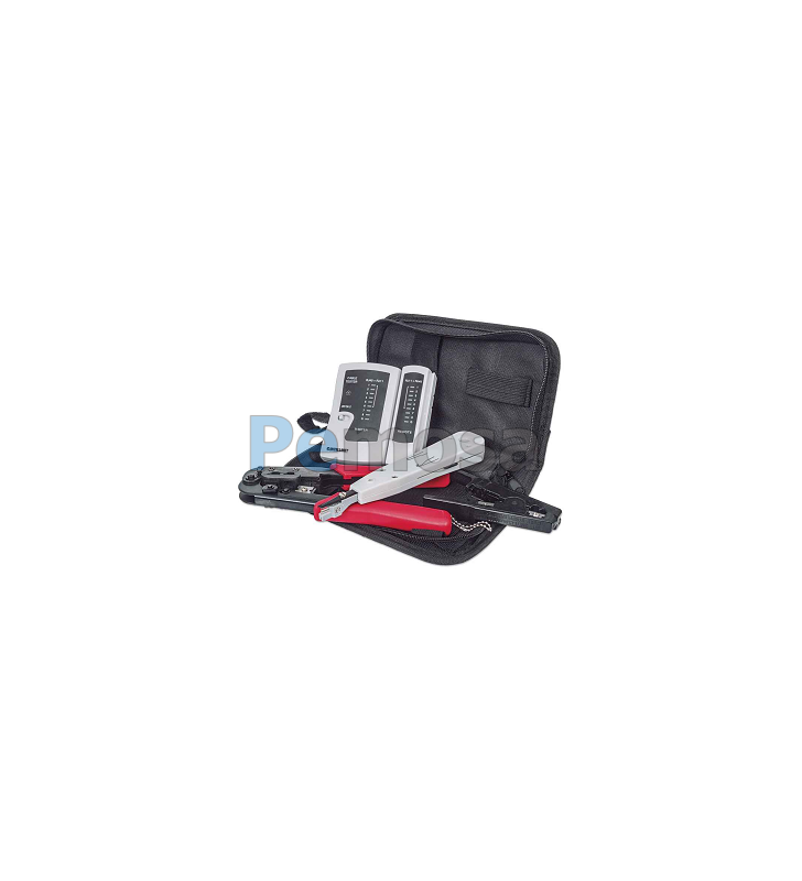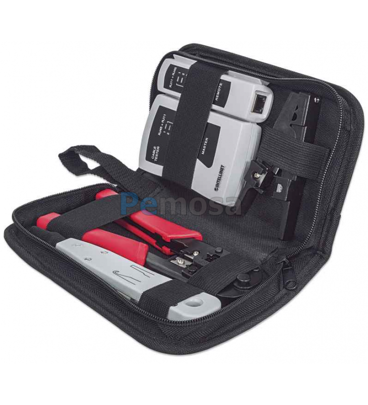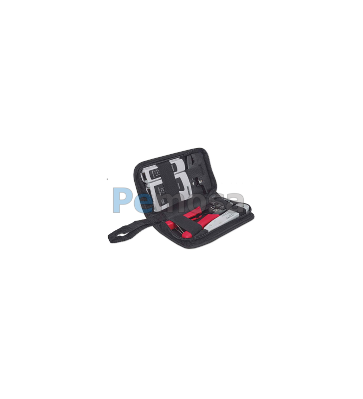 The Intellinet Network Solutions 4-Piece Network Toolkit enables both the professional installer and computer enthusiast to handle cabling, termination, and troubleshooting of a home or business network with relative ease. This kit includes an 8P8c modular plug crimper with wire cutter, an LSA punch down tool with 66 and 110/88 blades, a 4 1/2" diagonal cutter tool, and an RJ45/LAN cable tester set. RJ12/RJ11 This tool kit comes complete with a durable organizer bag for easy transport and storage.